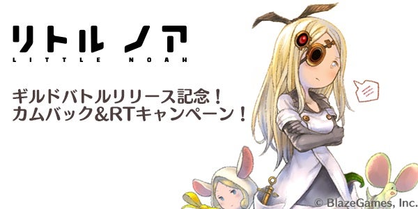 株式会社BlazeGames(以下ブレイズゲームス、本社:東京都渋谷区、代表取締役:岡田佑次)は、開発・運営を行うリアルタイムストラテジーゲーム『リトル ノア』において、ギルドバトルのリリースを記念し、ゲーム内でのカムバックキャンペーンと、Twitterリツイートキャンペーンを開催することをお知らせいたします。リツイートキャンペーンでは、指定ツイートが3000リツイートに到達したら、リツイートした人の中から抽選で2名にノアの声優を務める竹達彩奈さんのサイン入り色紙をプレゼントいたします。
